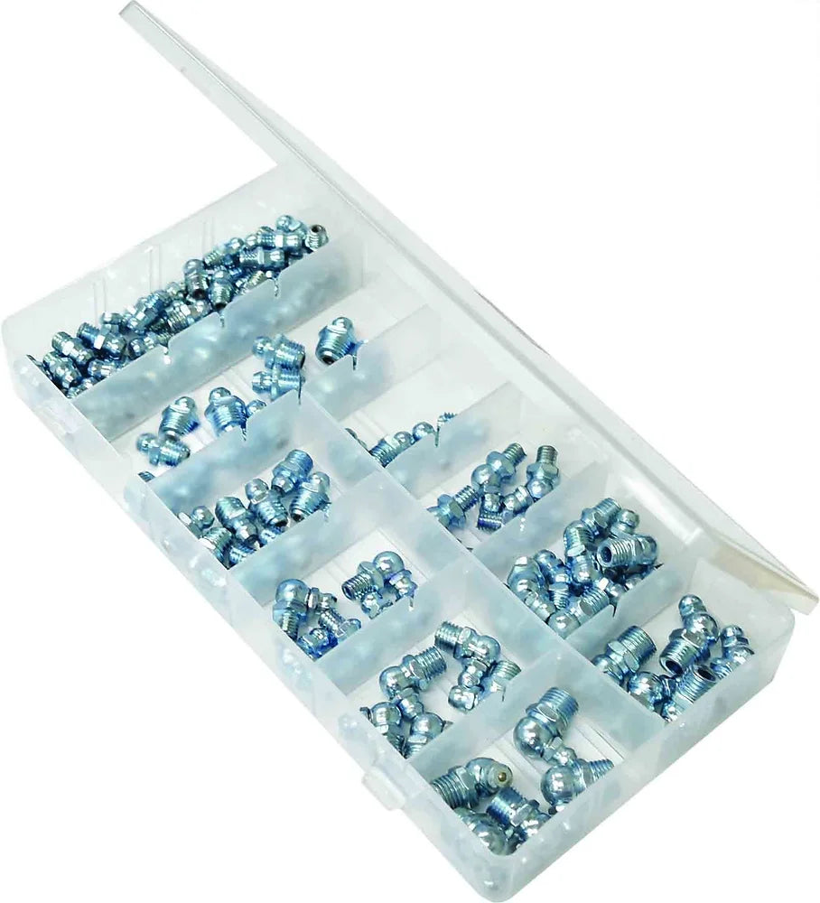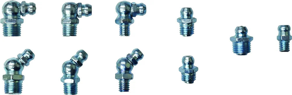 The assortment includes straight, 45°, and 90° angled fittings, allowing easy access to hard-to-reach grease points and ensuring complete lubrication coverage. Built for durability and consistent performance, each fitting provides a secure seal and reliable grease flow under pressure. All components are neatly organized for quick identification and ease of use.